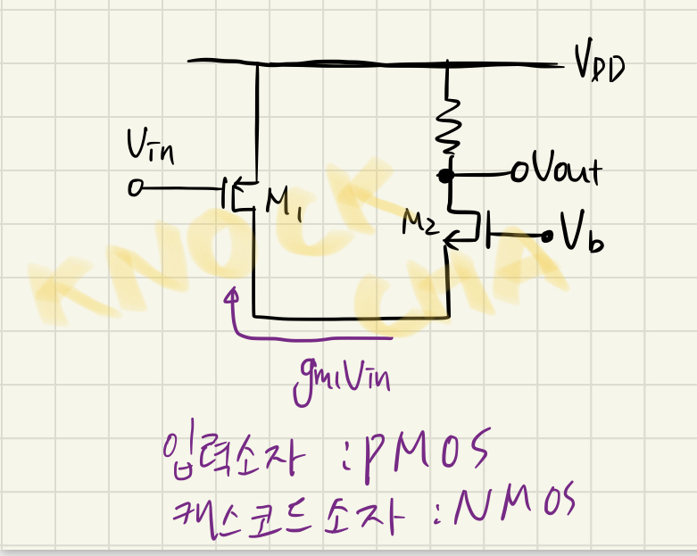 반대로 NMOS입력 PMOS캐스코드 소자인 캐스코드 토폴로지도 아래처럼 구성할 수 있다.