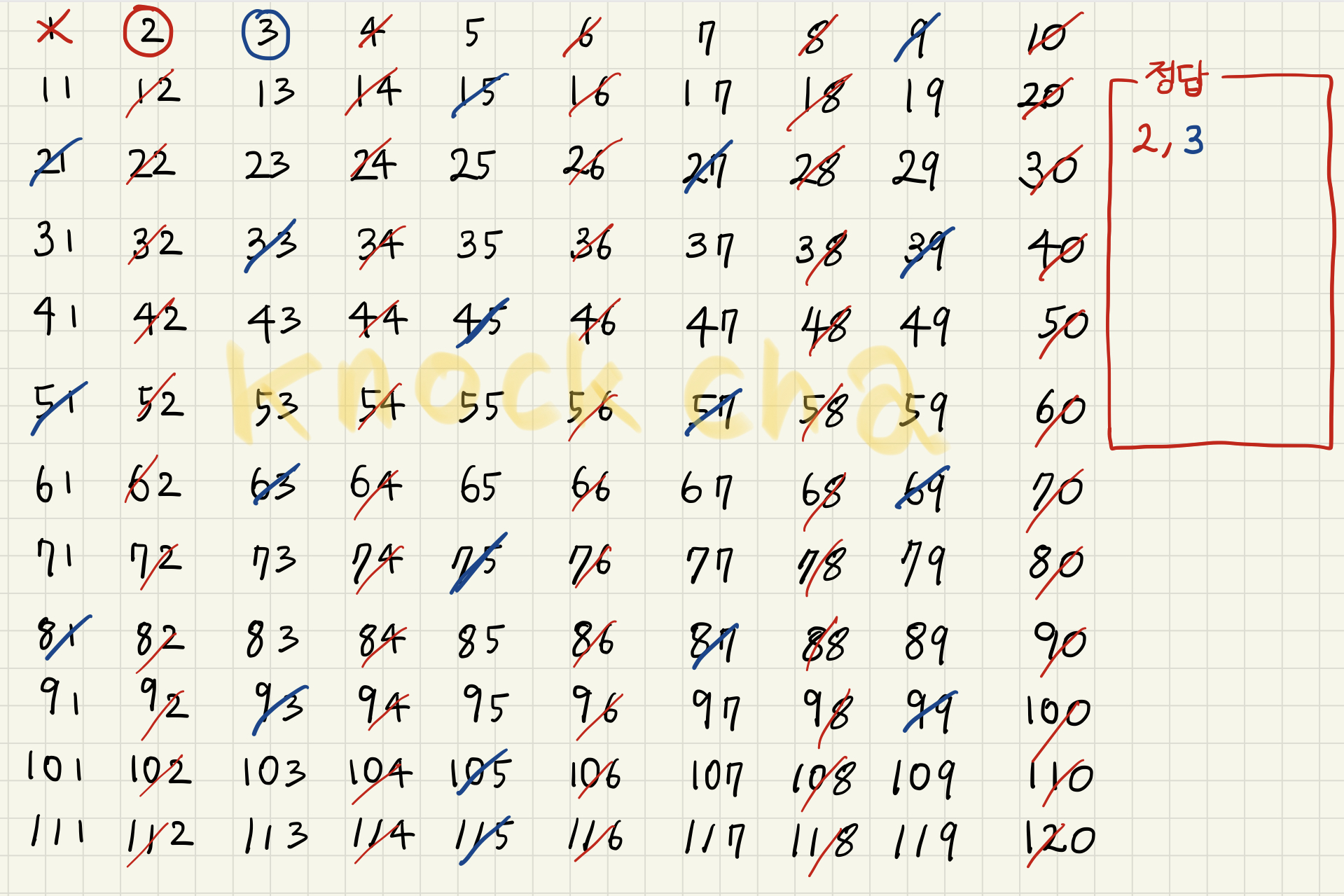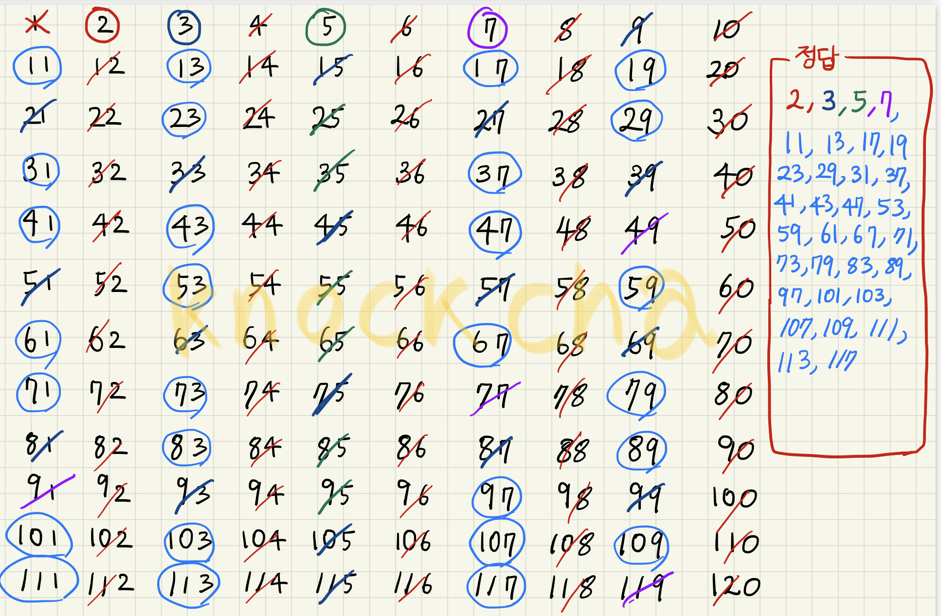 사실 다섯번째 인덱스 11에 관해서는 배수들을 검사하여 걸러낼 필요가 없다. 왜냐하면 11 * x에서 11보다 작은 x들은 이미 이전 인덱스에서 걸러졌기 때문이다. 따라서 인덱스 11에서 걸러지기 시작하는 최소 숫자는 11*11인 121인데, 이는 우리 문제의 범위를 초과한다. 따라서 인덱스 7까지 검사하고, 체에 남은 숫자들을 전부 정답 소수 리스트에 추가한다.