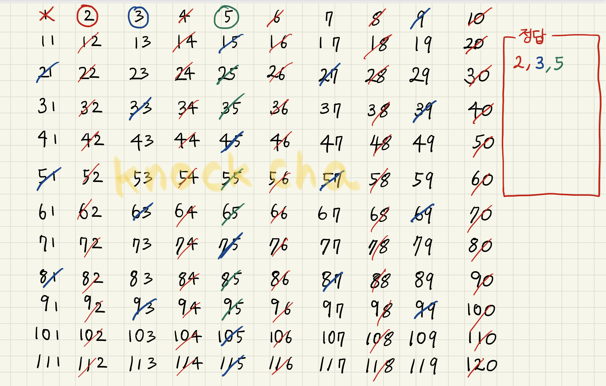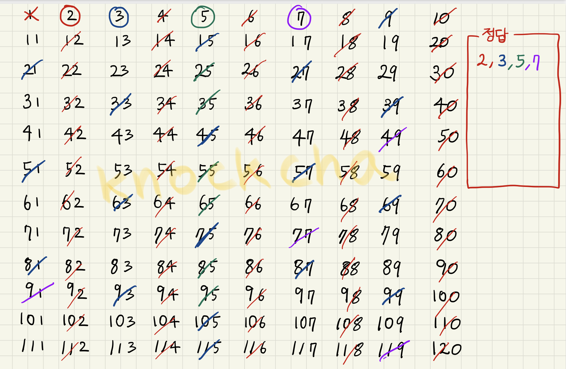 2, 3, 5의 배수들을 전부 걸러버리고 남은 가장 작은 소수는 7이다. 7을 정답 소수 리스트에 포함시키고 7의 배수들도 지워버린다.