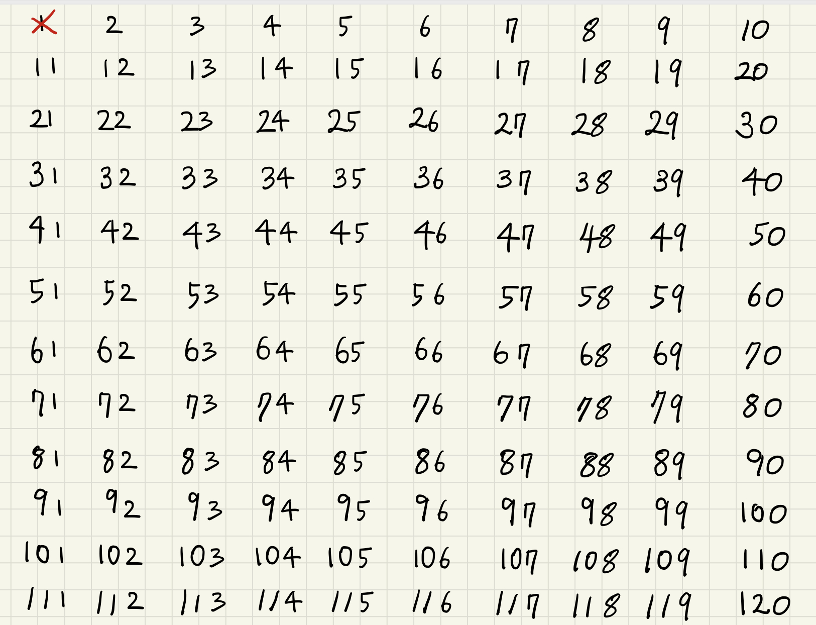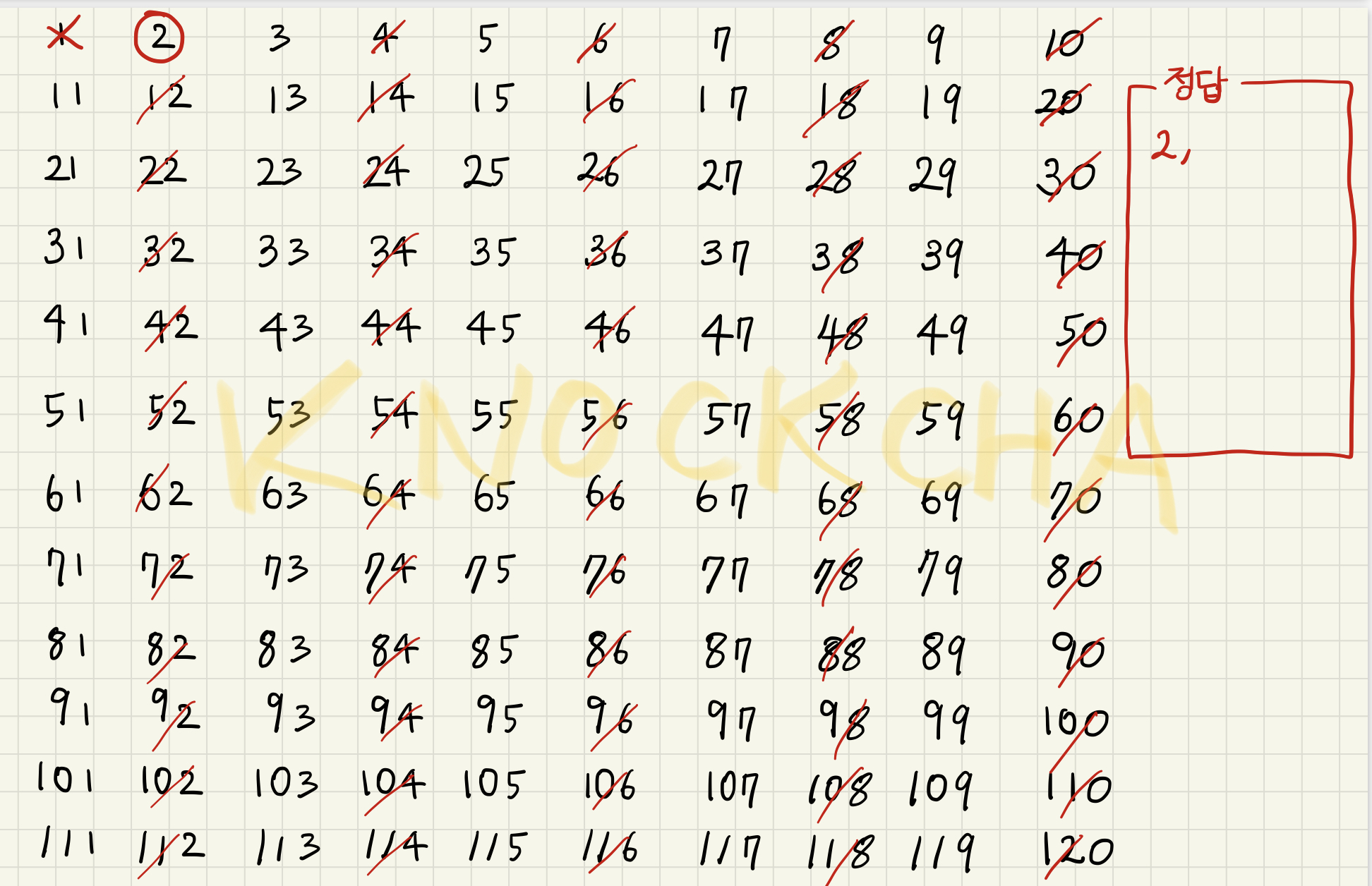 왜 에라토스테네스의 '체'라고 부르는 지 곧 알 수 있는데, 왜냐하면 일단 정수들을 나열해 놓고 소수가 아닌 수들을 걸러낼 것이기 때문이다!